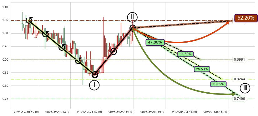 ➣ 调整浪已超过预测的c点位置,但后续大趋势循环浪高概率反转上涨,继续下跌概率47.80%,谨慎做空