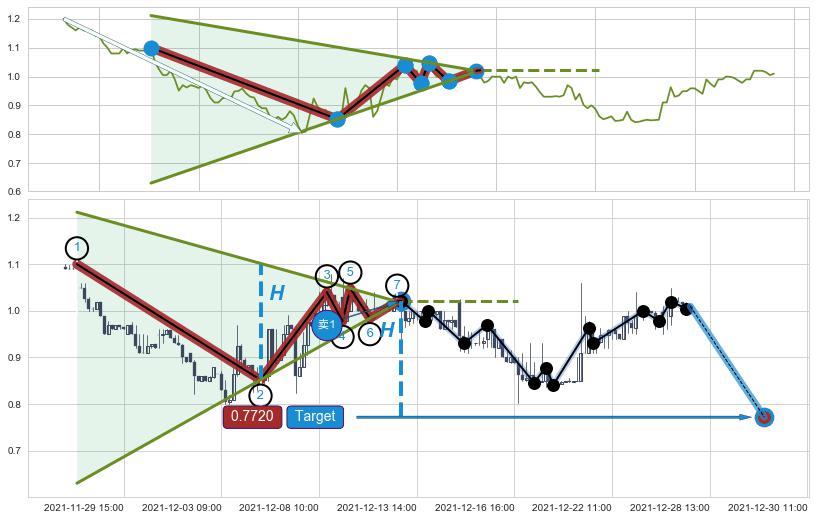 ➣ 【已确认突破】降🚩楔型 起点:12-07:12,突破点:12-21:10,形态共74交易小时