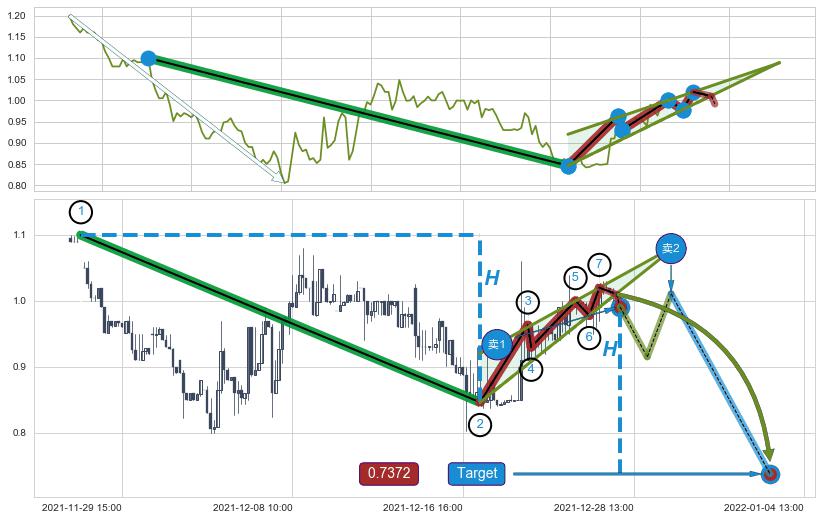 ➣ D点拟合预测价格1.1234,距离最后交易收盘价格1.0100相差 +11.23%