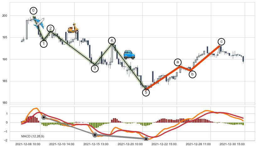 ➢ 波浪理论:猜想击穿突破c点后继续上涨 → 上涨 → 机会信号 → 小趋势跟踪