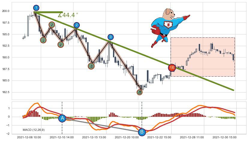 从2021-12-07 13:00至2021-12-20 13:00,共包含68个小时,阶段股价下跌-8.17%,阶段股价变动位移路程比: 1 : 3,下跌趋势角度: 44.4