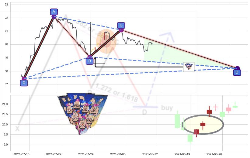 ➢ 谐波伽利:b上拉接近c:猜想阻力性下沉 → 下跌 →【拐点】阻力临近 → 大趋势均值回复
