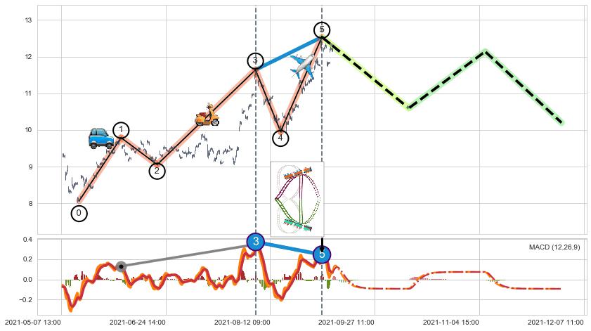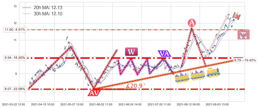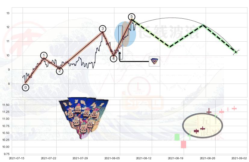 从2021-07-21 11:00至2021-08-17 11:00,共包含115个小时,阶段股价上涨9.90%,阶段股价变动位移路程比: 1 : 7