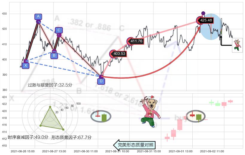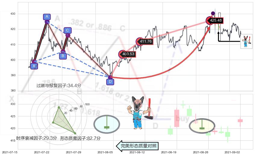 ➢ 谐波蝴蝶:d上涨已到达第❸目标:猜想阻力下沉 → 下跌 →【拐点】风险信号 → 大趋势均值回复