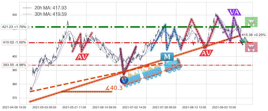 🍖 长线趋势跟踪组合短线均值回复[强支撑信号]2021-04-13 14:00-2021-08-26 13:00上升趋势依然成立(上涨趋势跟踪依然可行),短线价格略微下行回调(均值回复猜想),即将接近趋势提供的未破位的支撑价格:415.38。