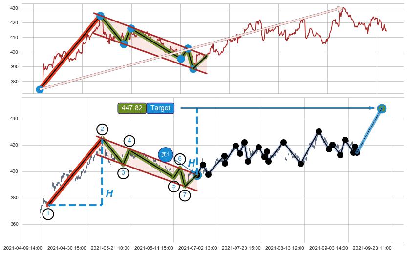 ➣ 降旗形:猜想预期上涨目标target即将达成,随后猜想强阻力来临,预期回调下跌(均值回复)