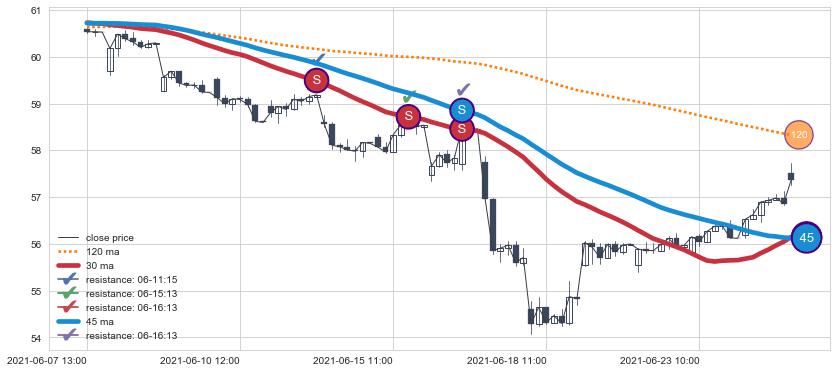 ➢ 最优均线组合共正确确认支撑阻力信号9处,正确确认率 60.00%