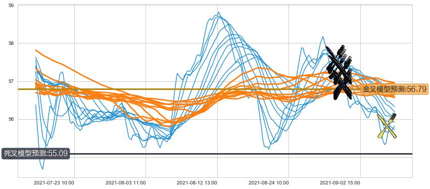 ➢ 30小时均线于(08-31 10:00: 57.59)形成【死叉】基于【死叉历史模型】预测死叉后最低波谷价格: 56.25, 死叉后最低价格55.19,已经下跌超出预测最低波谷价格, 预期反弹