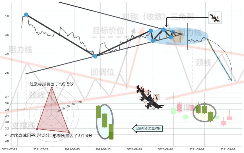➢ 【卖1】: 激进型 卖点→(09-02:12: 3.476 )形成突破下降【对称】三角形整理【整理】形态