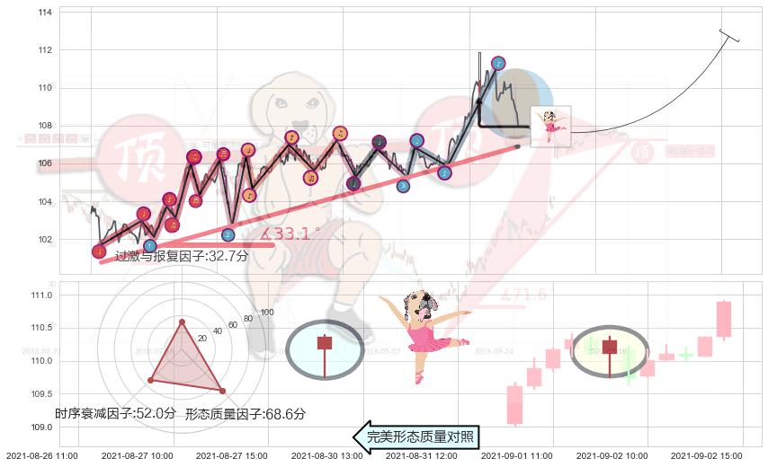 ♘ 在最后的上升阶段2021-06-24 10:00至2021-09-09 13:00存在 持续未破位的支撑位 ,支撑价格106.88,支撑可信任强度86.24%,其距离最后价格107.97相差 -1.01%