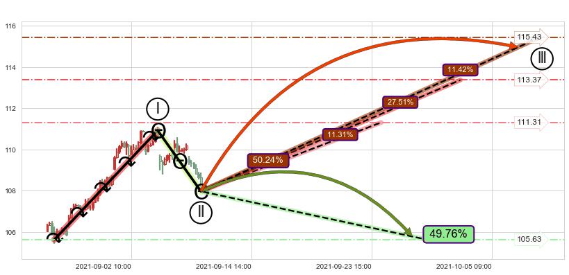 ➣ 循环浪继续向上【平均值】位置(10-01:10, 113.37),匹配聚类样本比例54.75%, 可能性概率27.51%