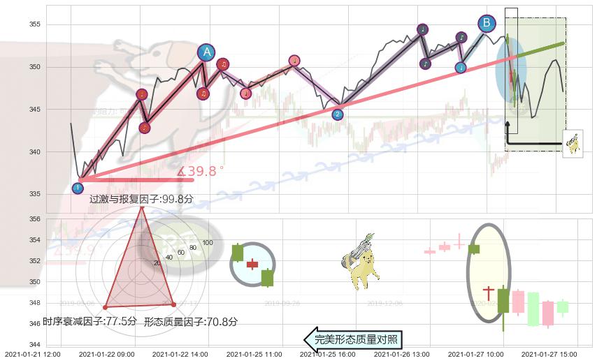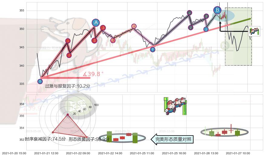 ➢ 2021-01-04 13:00-2021-01-27 11:00上升趋势存在反转[风险],其原上升趋势的支撑位(352.75)已破位[强阻力信号],原上升趋势角度: 39.8˚