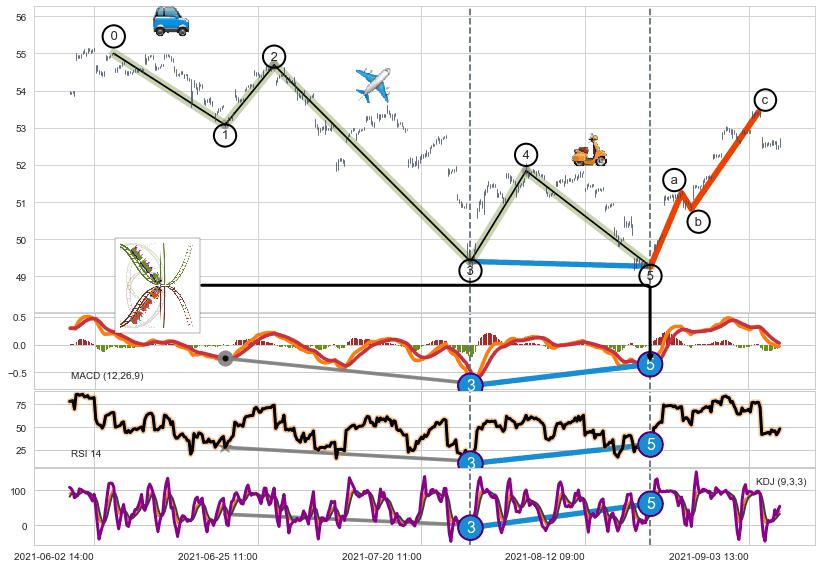 ➢ 波浪理论:猜想击穿突破c点后继续上涨 → 上涨 → 机会信号 → 小趋势跟踪