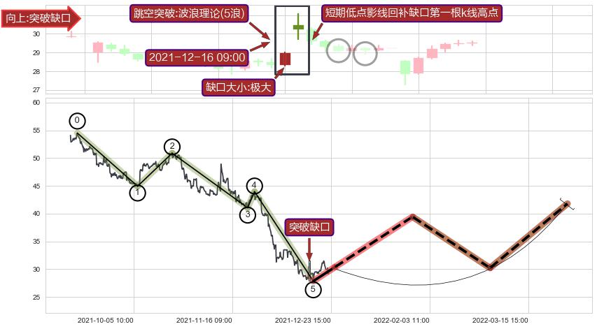 从2021-08-02 09:00至2021-12-21 13:00,共包含681个小时,阶段股价下跌-54.80%,阶段股价变动位移路程比: 1 : 9,下跌趋势角度: 31.1,2021-08-27 09:00向↘︎形成缺口,跳空下跌-14.34%˚