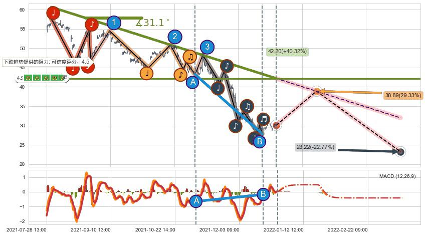 ♘ 阻力价格位45.52,可信任强度82.48%,距离最后交易2021-12-27 15:00形成的收盘价格30.07相差 +51.37%