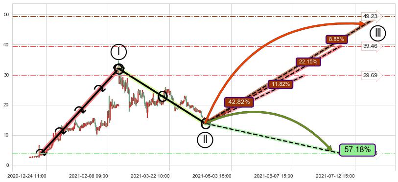 ➣ 调整浪已超过预测的c点位置,但后续大趋势循环浪高概率反转下跌,继续上涨概率42.82%,谨慎做多