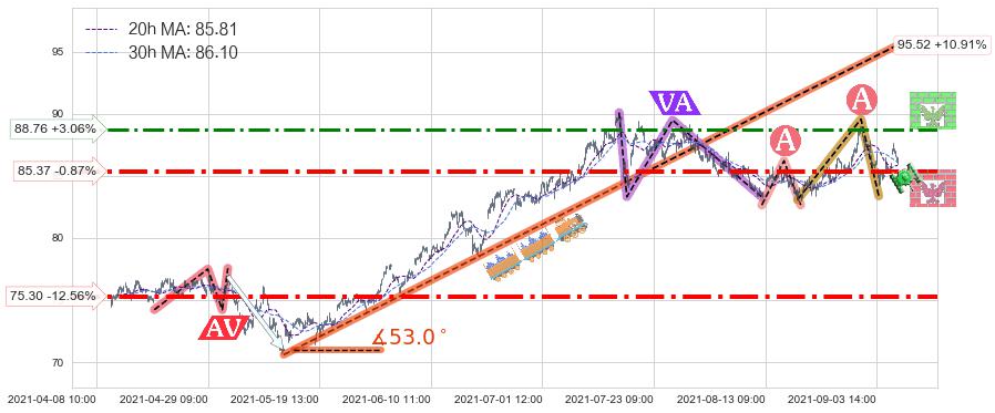 ♘ 阻力价格位88.76,可信任强度62.13%,距离最后交易2021-09-09 14:00形成的收盘价格86.12相差 +3.06%