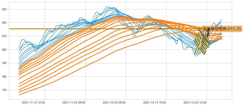 ➣ 60小时均线于(12-21 14:00: 205.88)形成【金叉】基于【金叉历史模型】预测金叉后最高波峰价格: 213.10, 金叉后最高价格222.78,已经上涨超出预测最高波峰价格, 预期回调