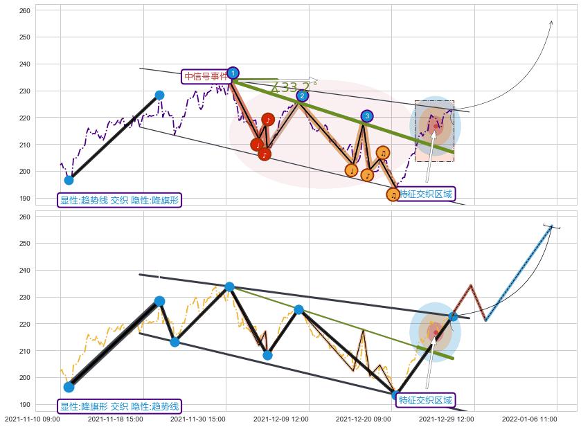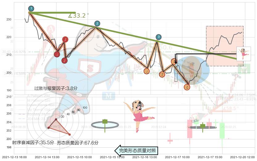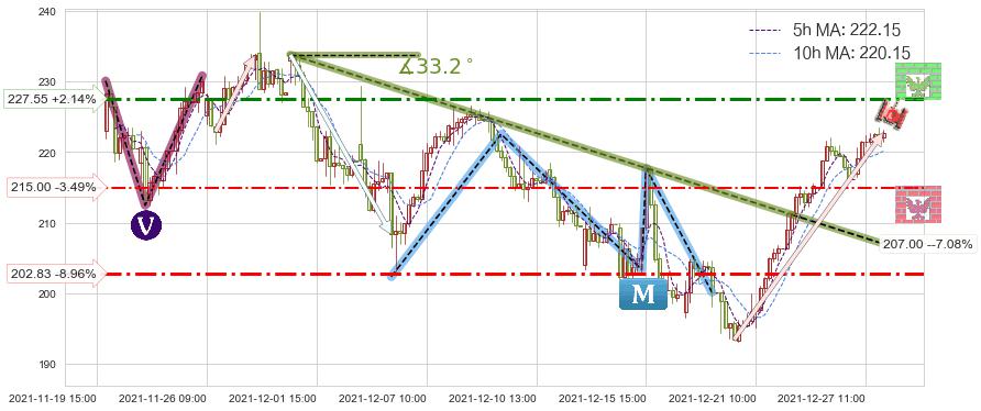 ➢ 2021-12-01 09:00-2021-12-22 10:00下跌趋势存在反转上涨[机会],其原下跌趋势的阻力位(207.00)已被突破[强支撑信号],原下跌趋势角度: 33.2˚