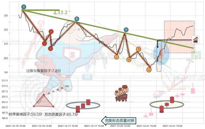 从2021-12-01 09:00至2021-12-22 10:00,共包含115个小时,阶段股价下跌-9.36%,阶段股价变动位移路程比: 1 : 9,下跌趋势角度: 33.2