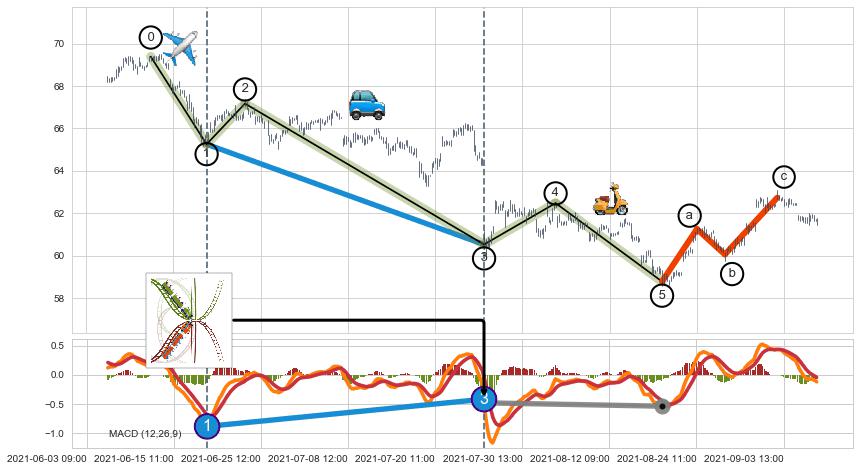 ➣ 波浪理论:猜想达到c点后小反弹终止反转下跌 → 下跌 → 【拐点】临近 → 阶段均值回复结束后继续大周期趋势跟踪