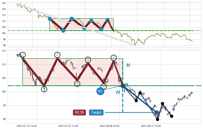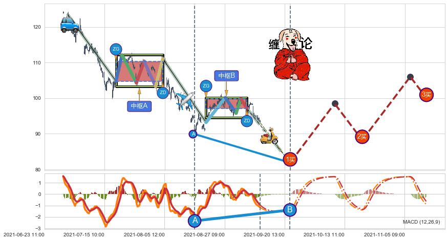 ➣ 缠论中枢点:猜想破位中枢B后持续下拉 → 下跌 → 破位中枢B支撑 → 持续趋势跟踪
