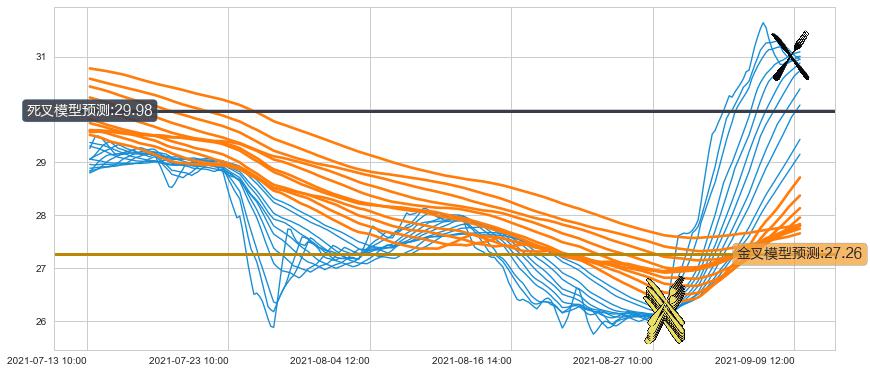 ➢ 21小时均线于(09-09 10:00: 31.00)形成【死叉】基于【死叉历史模型】预测死叉后最低波谷价格: 29.98, 死叉后最低价格30.99,尚未达到预测最低波谷价格, 预期继续下跌