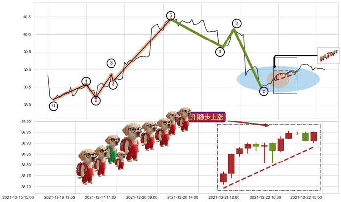 ➢ 波浪理论:猜想达到c点后小回调终止反转上涨 → 上涨 → 【拐点】临近 → 阶段均值回复结束后继续大周期趋势跟踪