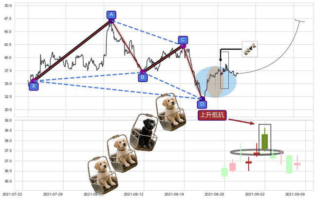 ➢ 谐波蝴蝶:c下跌到达d:猜想拉升 → 上涨 →【拐点】强支撑临近 → 大趋势均值回复
