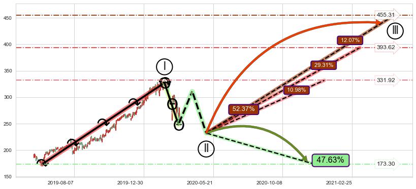 ➣ 循环浪继续向上【平均值】位置(2021-03-12, 393.62),匹配聚类样本比例55.97%, 可能性概率29.31%