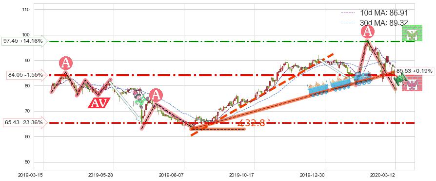 ♘ 支撑价格位84.05,可信任强度78.97%,距离最后交易2020-03-13形成的收盘价格85.37相差 -1.55%