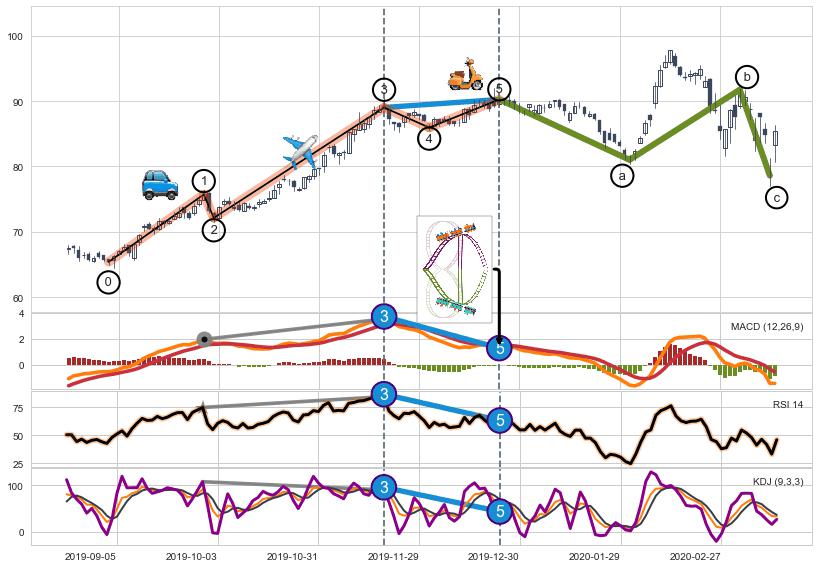 ➣ 波浪理论:猜想达到c点后小反弹终止反转下跌 → 下跌 → 【拐点】临近 → 阶段均值回复结束后继续大周期趋势跟踪