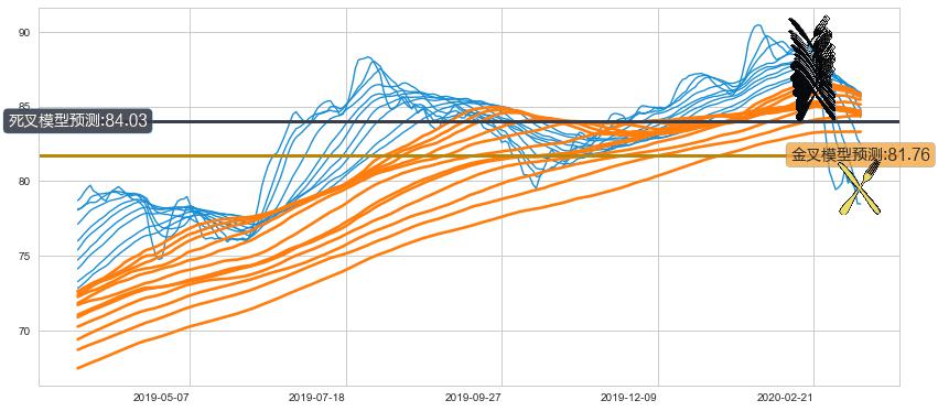 ➣ 80小时均线于(2020-02-21: 86.36)形成【死叉】基于【死叉历史模型】预测死叉后最低波谷价格: 82.51, 死叉后最低价格74.74,已经下跌超出预测最低波谷价格, 预期反弹