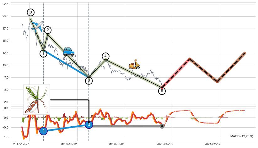 ➣ 第一, 三, 五浪下跌动能逐渐【衰弱变小】,趋势呈现不稳迹象