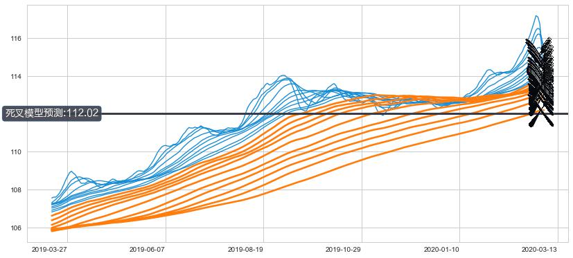 ➣ 120小时均线于(2020-03-11: 113.39)形成【死叉】基于【死叉历史模型】预测死叉后最低波谷价格: 111.73, 死叉后最低价格110.13,已经下跌超出预测最低波谷价格, 预期反弹