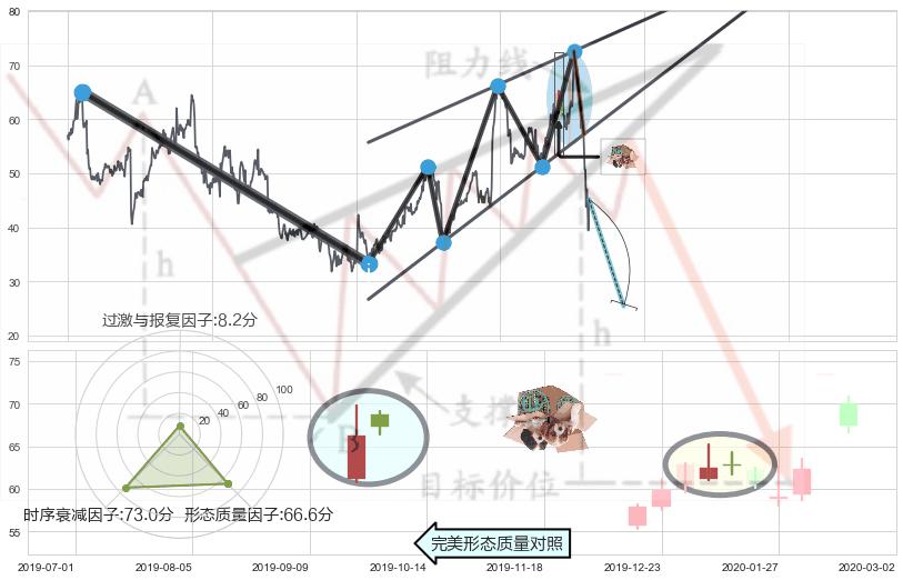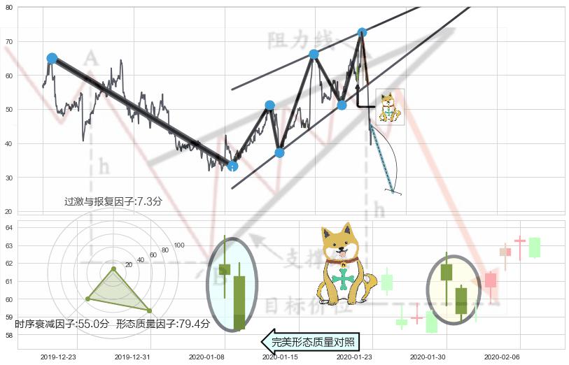 ➢ 🕰 价格走势在2020-01-06至2020-01-13期间形成顶部尽头线(下山虎),残存影响值:-2.80