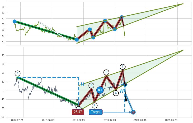 ➢ 最小中继整理跌幅→𝐇: 31.74 (𝐇楔型旗杆的长度:楔型起点→顶点)