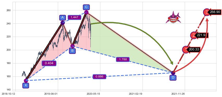 ➢ 距离预测D点位置有足够的下跌空间, 与看涨【鲨鱼】形态相反,实际方向【看跌】