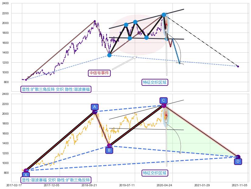 ➣ 扩散三角反转:猜想临近关键支撑位突破点 → 临近拐点下跌 → 风险信号 → 大趋势均值回复