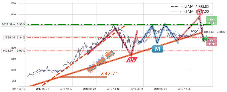 ➣ 2017-03-21-2020-03-11上升趋势存在反转[风险],虽然原上升趋势的支撑位(1853.66)已破位,但其支撑效果尚存,原上升趋势角度: 42.7˚