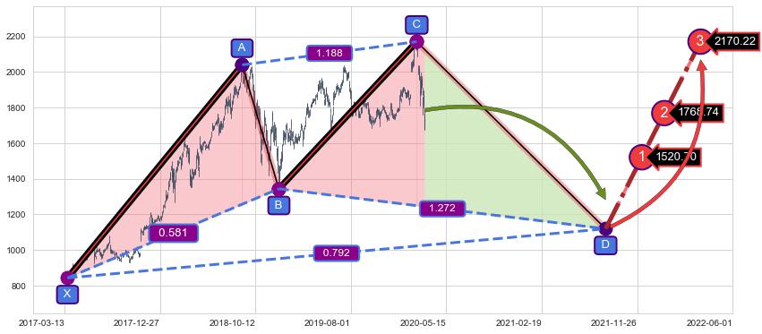 ➣ AI预测: 假定反转启动后, 第❶目标位置(2021-12-10, 1520.70)