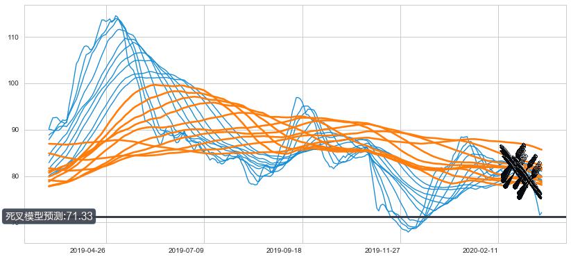 ➢ 55小时均线于(2020-02-24: 80.84)形成【死叉】基于【死叉历史模型】预测死叉后最低波谷价格: 70.81, 死叉后最低价格67.87,已经下跌超出预测最低波谷价格, 预期反弹