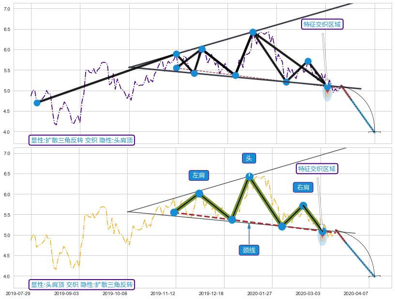 ➣ 扩散三角反转:下行突破支撑位破位, 猜想持续下沉下跌,被突破的支撑位已变为阻力位