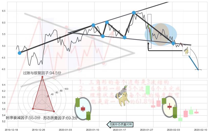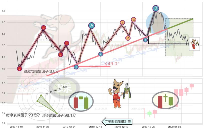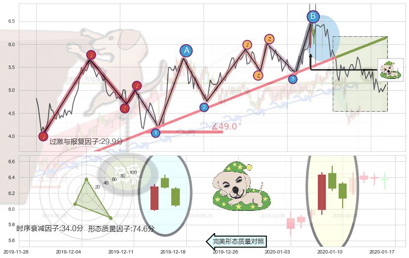 ➢ 🕰 价格走势在2020-01-06至2020-01-13期间形成顶部尽头线(下山虎),残存影响值:-5.70