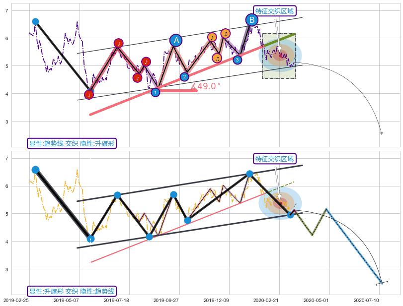 ➣ 升旗形:猜想临近关键支撑位突破点 → 临近拐点下跌 → 风险信号 → 大趋势均值回复