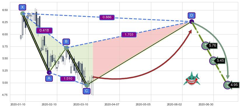 ➢ 曙光初现形态 🔜 谐波鲨鱼下沉击穿c上涨拐点 综合量化分数:50.81 【中性】
