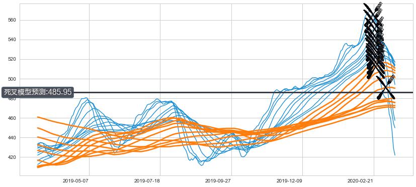 ➣ 70小时均线于(2020-02-24: 516.55)形成【死叉】基于【死叉历史模型】预测死叉后最低波谷价格: 478.51, 死叉后最低价格386.22,已经下跌超出预测最低波谷价格, 预期反弹