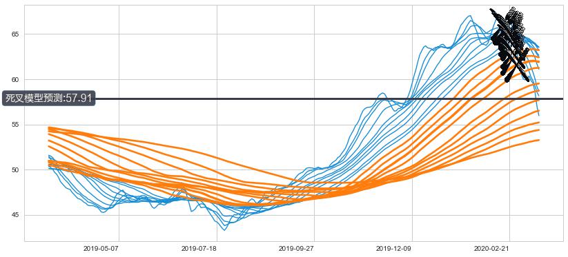 ➣ 70小时均线于(2020-02-24: 62.92)形成【死叉】基于【死叉历史模型】预测死叉后最低波谷价格: 56.36, 死叉后最低价格52.75,已经下跌超出预测最低波谷价格, 预期反弹