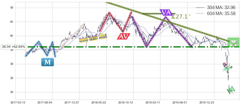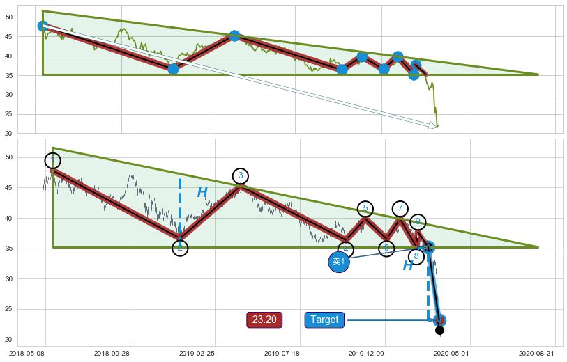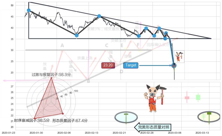 ➢ 【多方力量耗尽,空方打破攻守平衡点】下降三角形中继整理, 已在2020-02-24突破【支撑】颈线 35.23 →演变成下降通道
