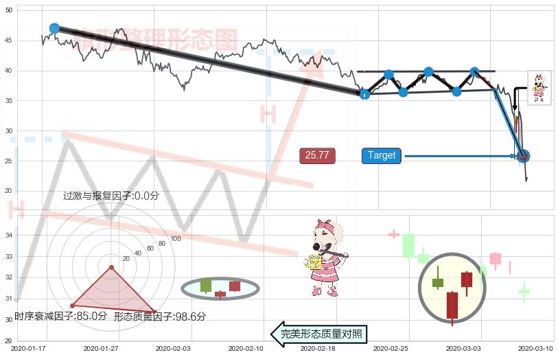 从2018-05-21至2020-03-13,共包含457个交易日,阶段股价下跌-69.44%,阶段股价变动位移路程比: 1 : 6,下跌趋势角度: 25.8,2020-03-09向↘︎形成缺口,跳空下跌-19.10%˚